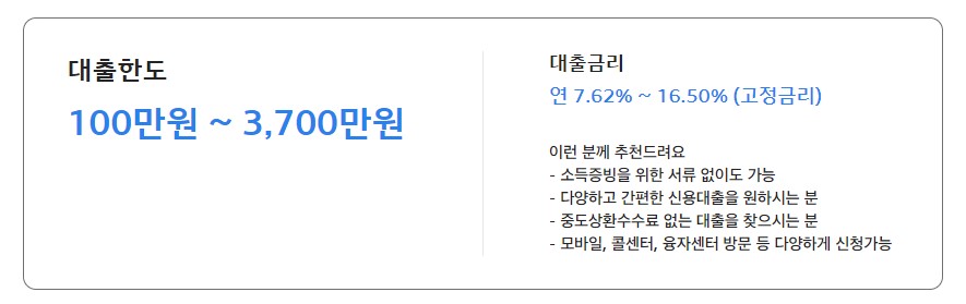 대출 한도는 100만원에서 최대 3,700만원까지입니다. 대출 금리는 **연 7.62%에서 16.50%**로, 고정금리로 제공돼요. 금리가 고정되어 있어서 대출 기간 동안 변동 없이 일정한 이자를 부담하게 되어 예측 가능한 재무 계획이 가능하답니다.