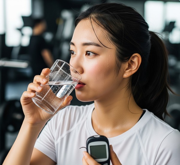 운동 중에는 땀으로 수분과 전해질이 빠져나가요. 운동 전후에 물을 충분히 마셔 탈수를 예방하고 혈당 변화를 막아야 합니다.