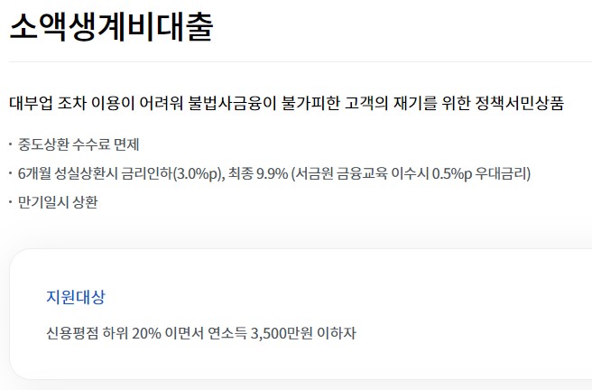 소액생계비대출은 대부업체조차 이용하기 힘들어 불법사금융에 의존할 수밖에 없는 고객분들의 재기를 돕기 위한 정책 서민 상품입니다. 특히 신용평점 하위 20% 이면서 연소득이 3,500만 원 이하인 분들을 위해 마련된 지원책입니다.