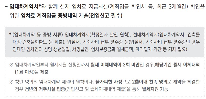 전입신고가 되어 있어야 하고 임대차계약서와 함께 실제로 임차료를 지급한 사실을 증빙해야 합니다. 통상적으로 통장 3개월 내역(월세입금내용 3회차 확인되게)을 출력해서 제출하면 됩니다.