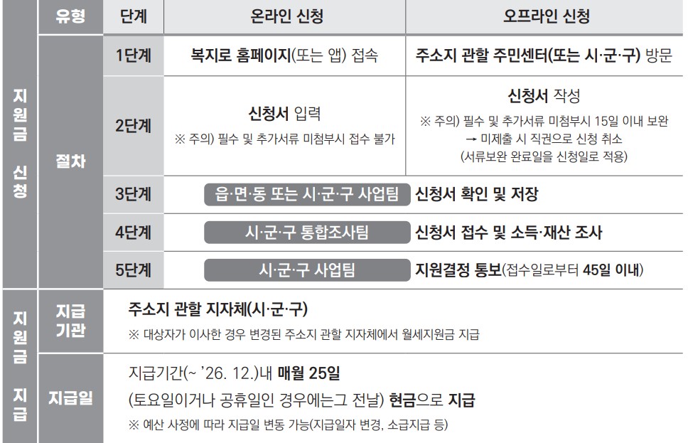 - 주소지 관할 주민센터 방문 또는 복지로[링크] 에서 온라인 신청