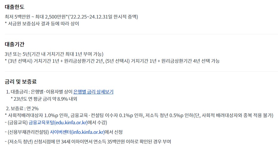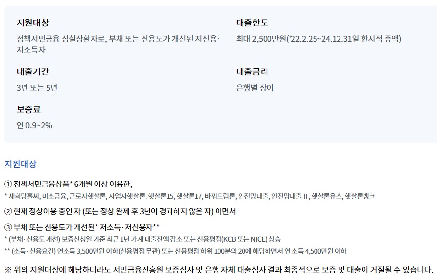 이 자격조건을 충족하더라도 서민금융진흥원 보증심사와 은행 자체 대출심사에서 최종적으로 보증 및 대출이 거절될 수 있다는 점도 유의해주세요.